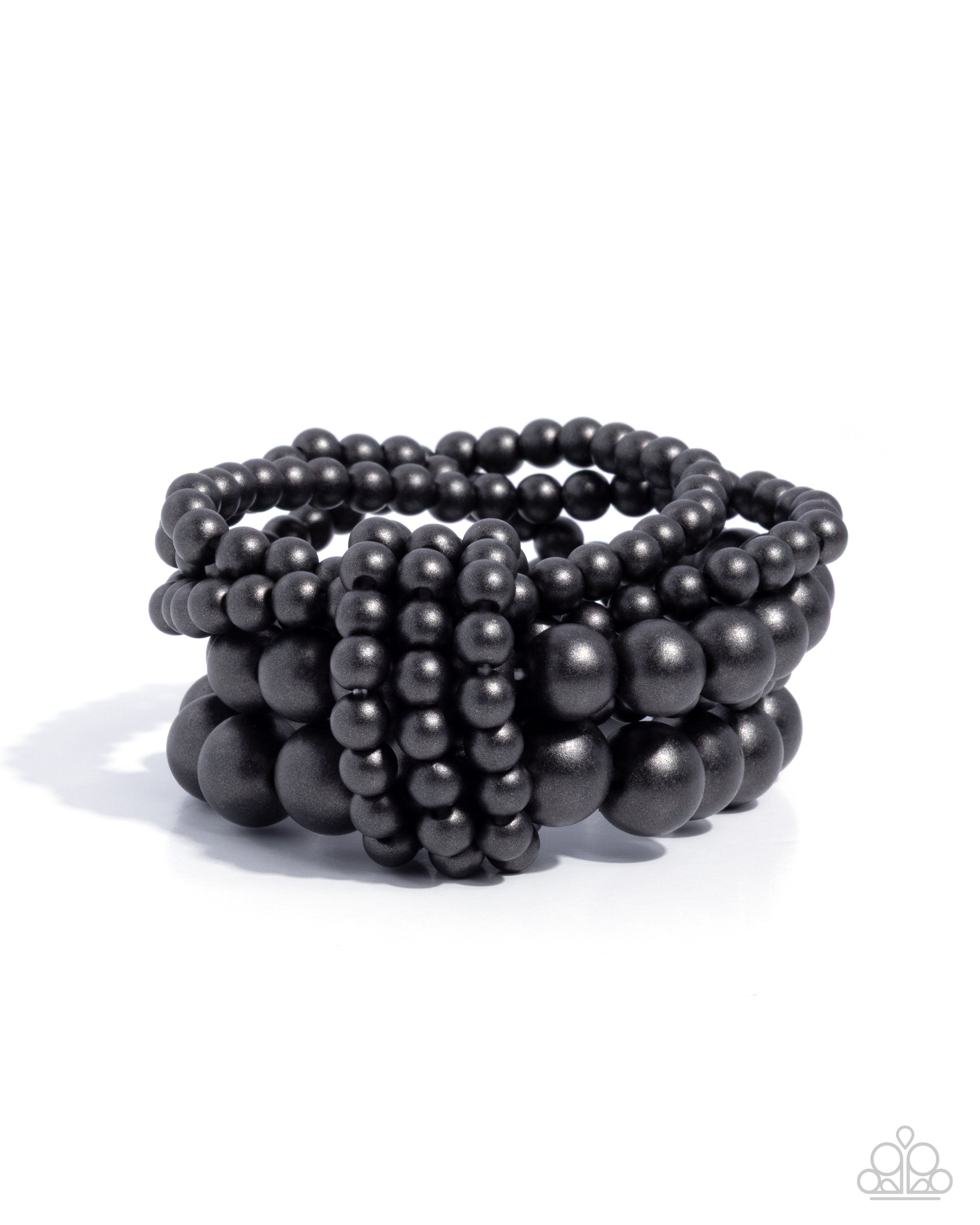 Featuring a polished finish, a collection of black wood beads in varying sizes stacks along the wrist along elastic stretchy bands for a rustic pop of color.