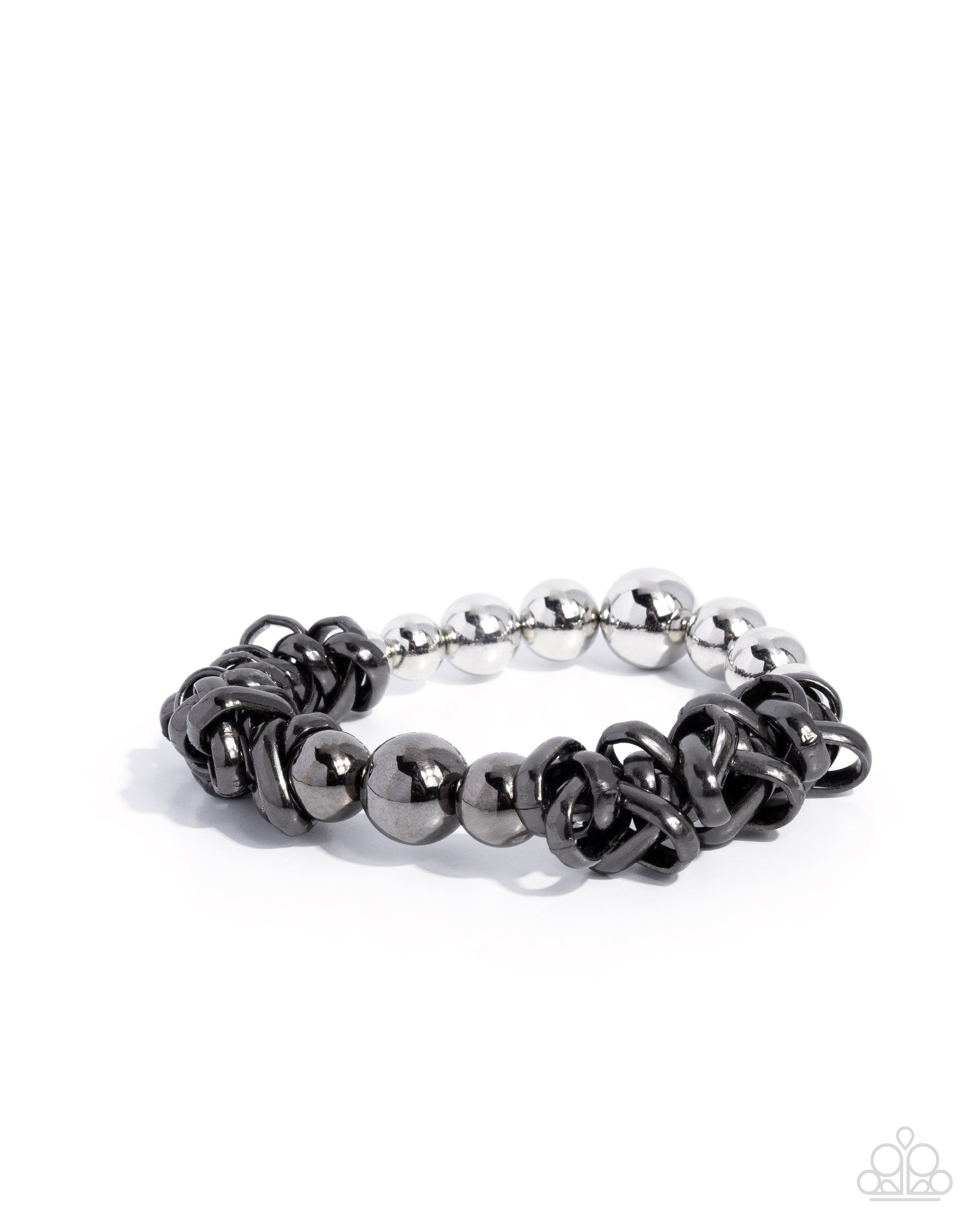 Infused along an elastic stretchy band, a collection of polished silver beads in varying sizes joins gunmetal beads and an abstract collision of gunmetal links atop the wrist for a dramatic, dominant display.