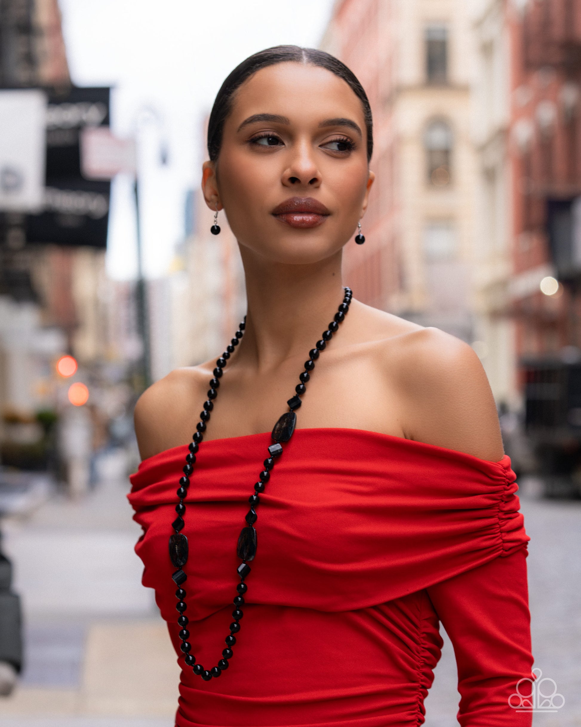 Infused along black knotted cording, a collection of glossy black beads, textured black square beads, and faceted, abstract, black cloudy beads, patterns below the chest for a simple pop of color and class. Features an adjustable clasp closure.