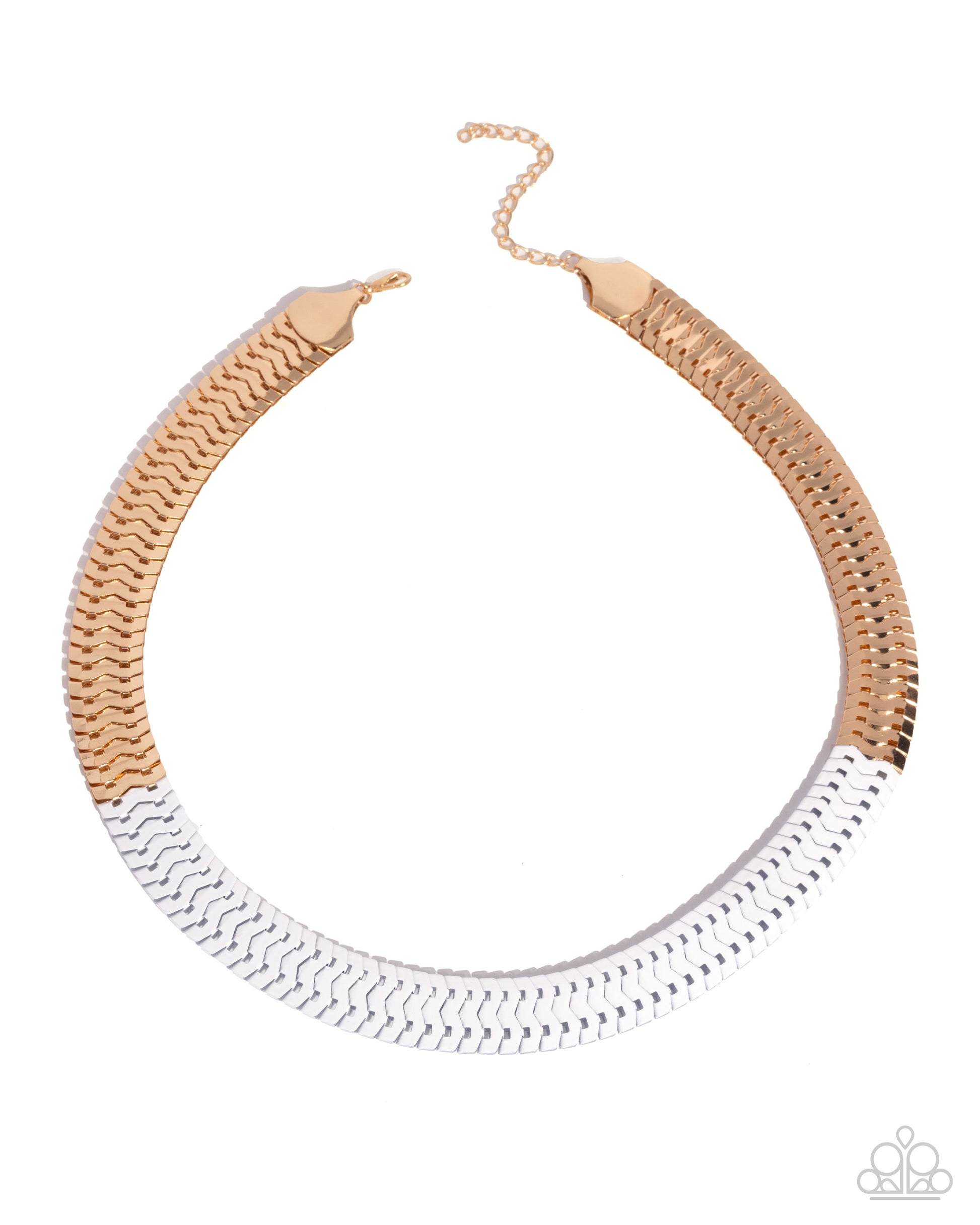 Sleek rows of gold and white-painted snake-like chains weave together to create a bold and dynamic statement collar. The metallic tones reflect light with every move, giving this necklace a modern and polished look that transitions effortlessly from day to evening wear. Features an adjustable clasp closure.