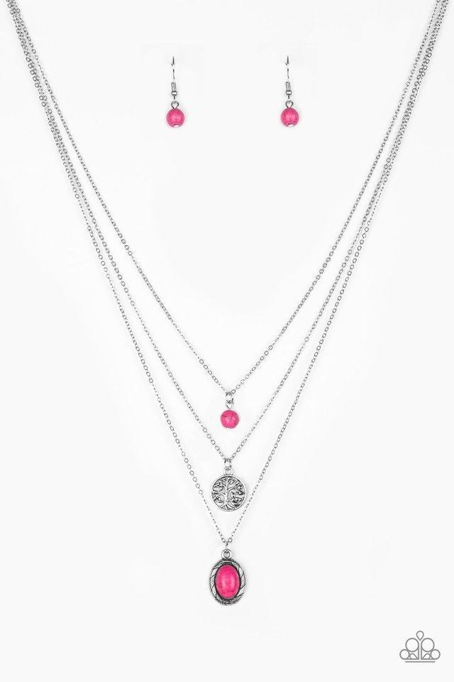 Three shimmery silver chains layer down the chest. A vivacious pink stone bead swings from the uppermost strand, above a radiant silver tree charm and an ornate pink stone pendant for a seasonal look. Features an adjustable clasp closure.
