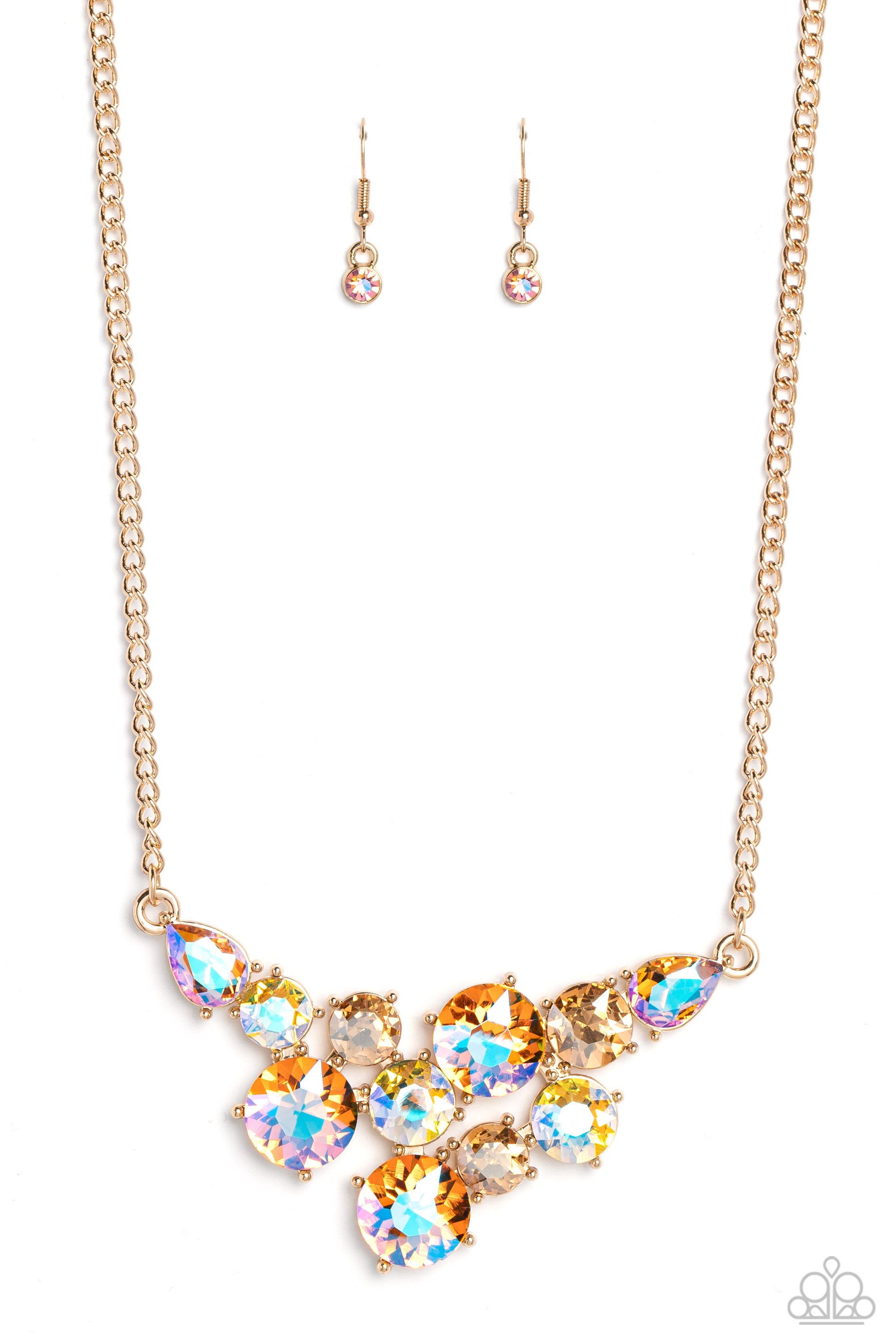 An explosion of round gems in varying sizes bordered by teardrop gems cluster together to create a glittery gold fringe down the neckline. Featured in golden undertone and golden iridescent hues, each gem reflects light off of its faceted surface emitting further glitz and glam. Features an adjustable clasp closure. Due to its prismatic palette, color may vary.